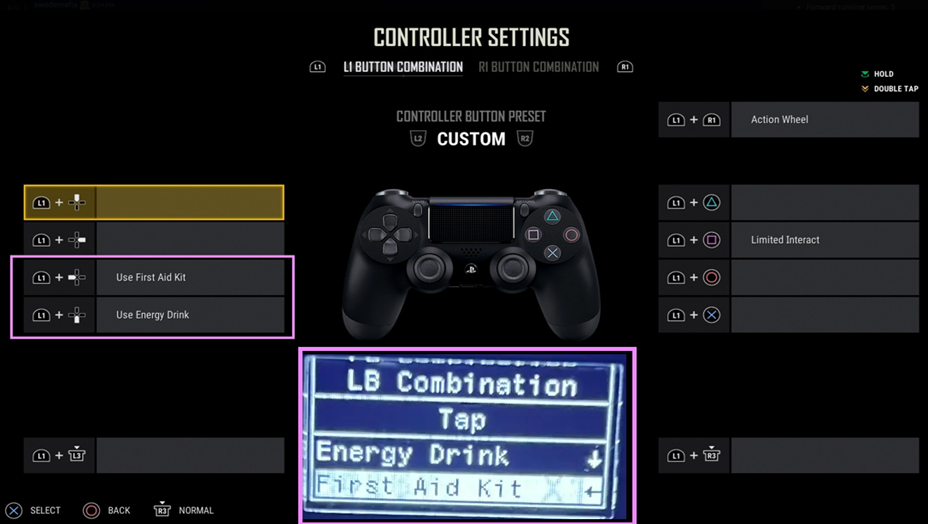- Example: If L1 + DPAD LEFT is First Aid and L1 + DPAD DOWN is Energy Drink:
